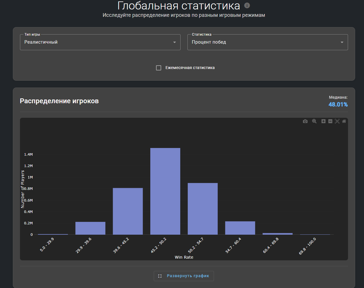 Класс. Это то, что мы хотели. И это не учитывая эффективность в бою, когда даже с винрейтом 45% из-за большей эффективности в бою победы покрывают любые минусы поражения.
