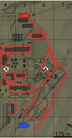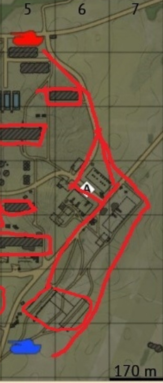 Да там в окнах только слепой танк не увидит, я об этом. А стоя где нибудь на Щвеции в рандом месте, жди с 10 сторон прилет, плюс звуки двигла по засвету и гг. Еще на Щвеции между точками Б и С не обвел застройку, 5 или 6 домов, то есть красных линий возможного прихода недруга. На заводе проще сплошняком заливать, а не линиями и это будет отснотильно пустое место без приград.