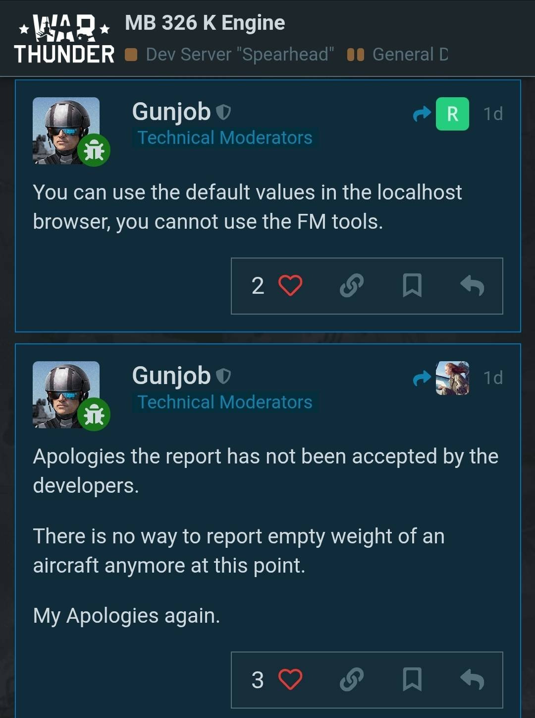 @Ralin я извиняюсь за дёрганье, два микровопроса. во-первых, что там произошло в багрепортной, что репортить вес пустого самолёта больше нельзя, и связано ли это с последними срачами по поводу репортов рафаля и МБК? и во-вторых, могут нам уже дать отписку, что именно некорректно вот в этом репорте мига 29? а то там уже целый минифорум образовался MiG-29 noticeably underperforming in ITR // Gaijin.net // Issues