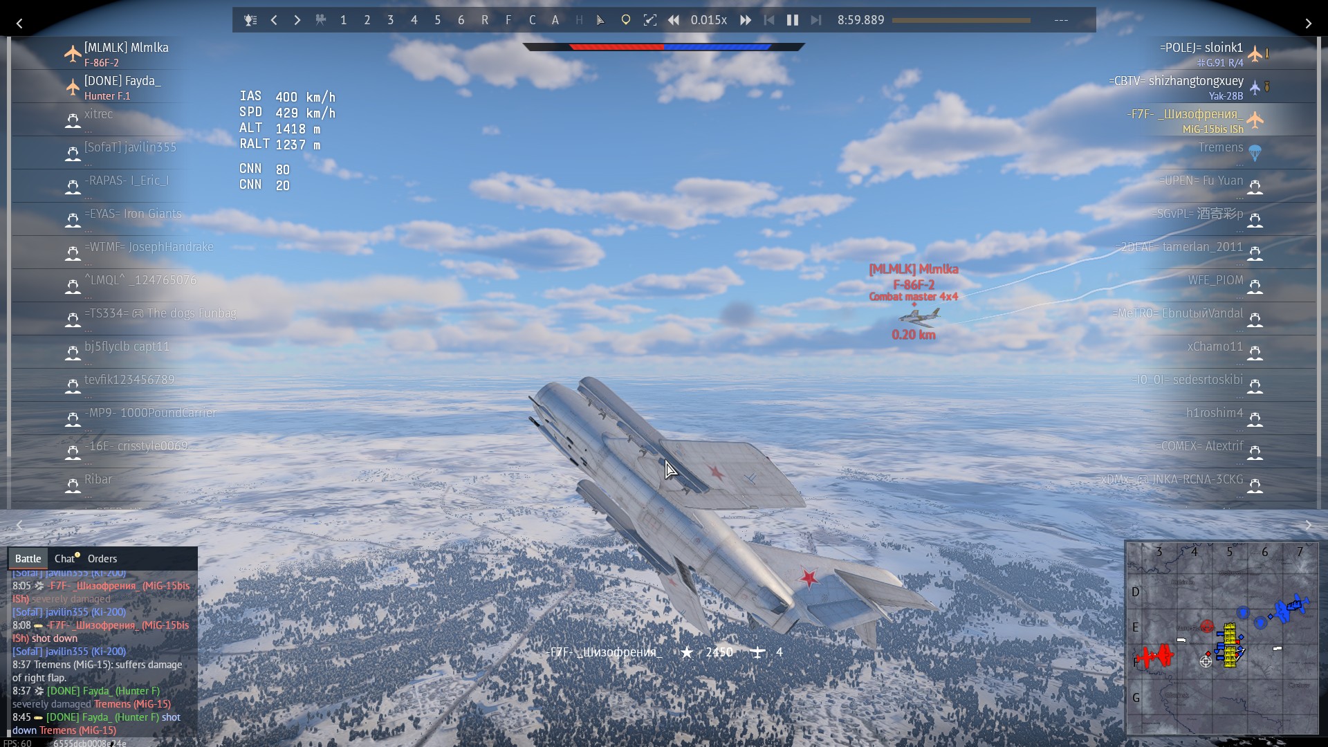 Он в 5 км на карте где-то рядом засветился, поэтому срочно пришлось выходить из пропуска на высоте 1600 м и со скоростью 200 км/ч против 15бис ИШ в такой позиции (2 км, 240 км/ч)