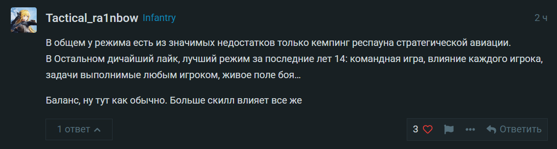Можно было бы списать это на первый день и всё такое, но я слишком хорошо знаю эту игру. Собственно, не об этом ли я писал каждый раз, когда заходила речь о новом геймплее? НИКТО НЕ ХОЧЕТ ДУМАТЬ. Режим был бы интересен для слаженных команд с продуманной тактикой, я действительно вижу в нём потенциал в рамках, допустим, полковых боёв. Но в рандоме это просто вакханалия, в которой победа зависит от конкретного игрока намного меньше, чем в АРБ или ТРБ. В этом есть ощущение хаоса большой войны, но интересно ли в это играть?