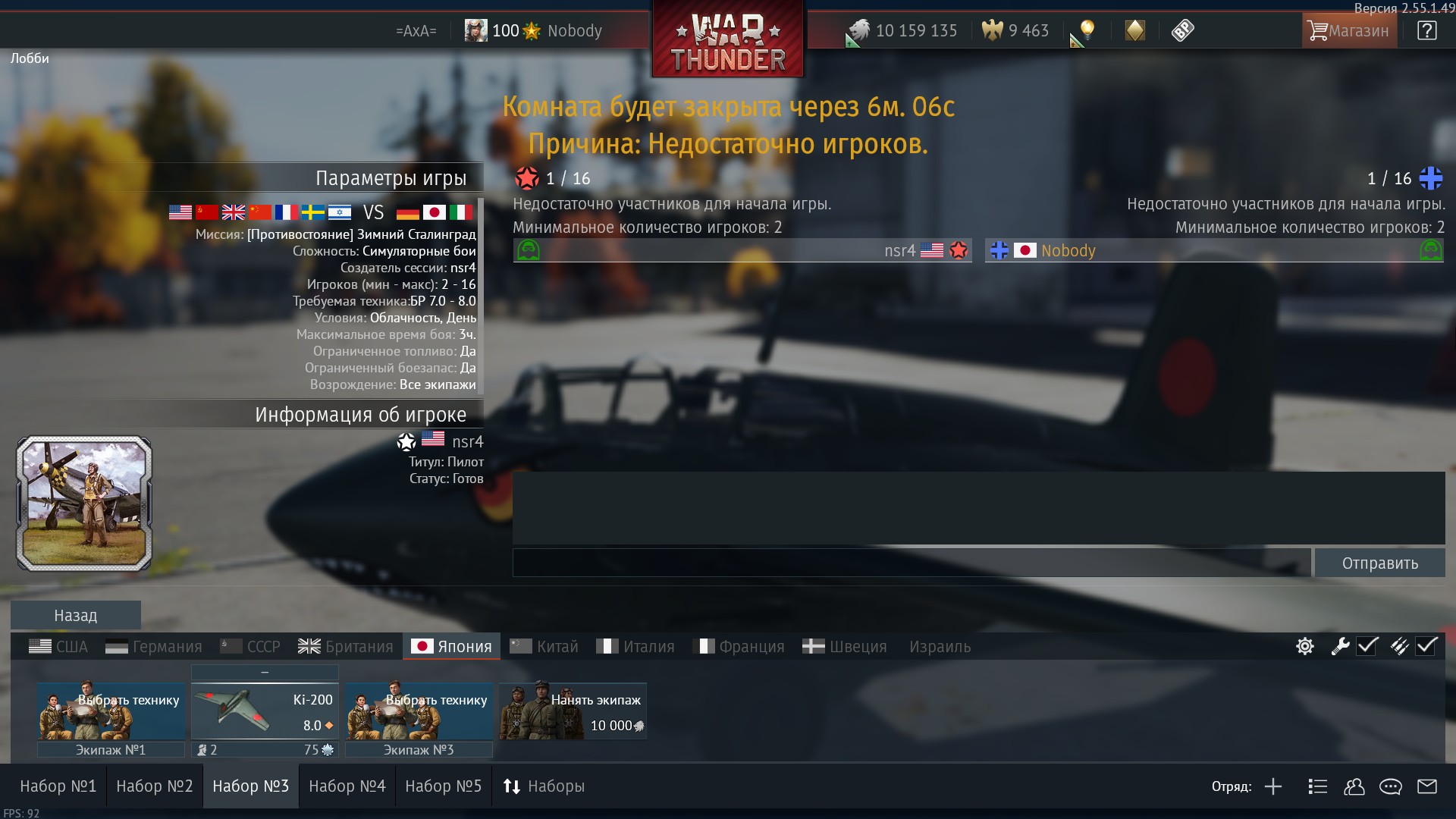 Вчера был Бээр 8.0, ну, думаю, пойду покачаю Ки-200, тем более что Ту-95 по бээру не проходит. А хрен там — нет сессий. Два раза простоял в очереди на карту Зимний Сталинград, так никто и не присоединился.