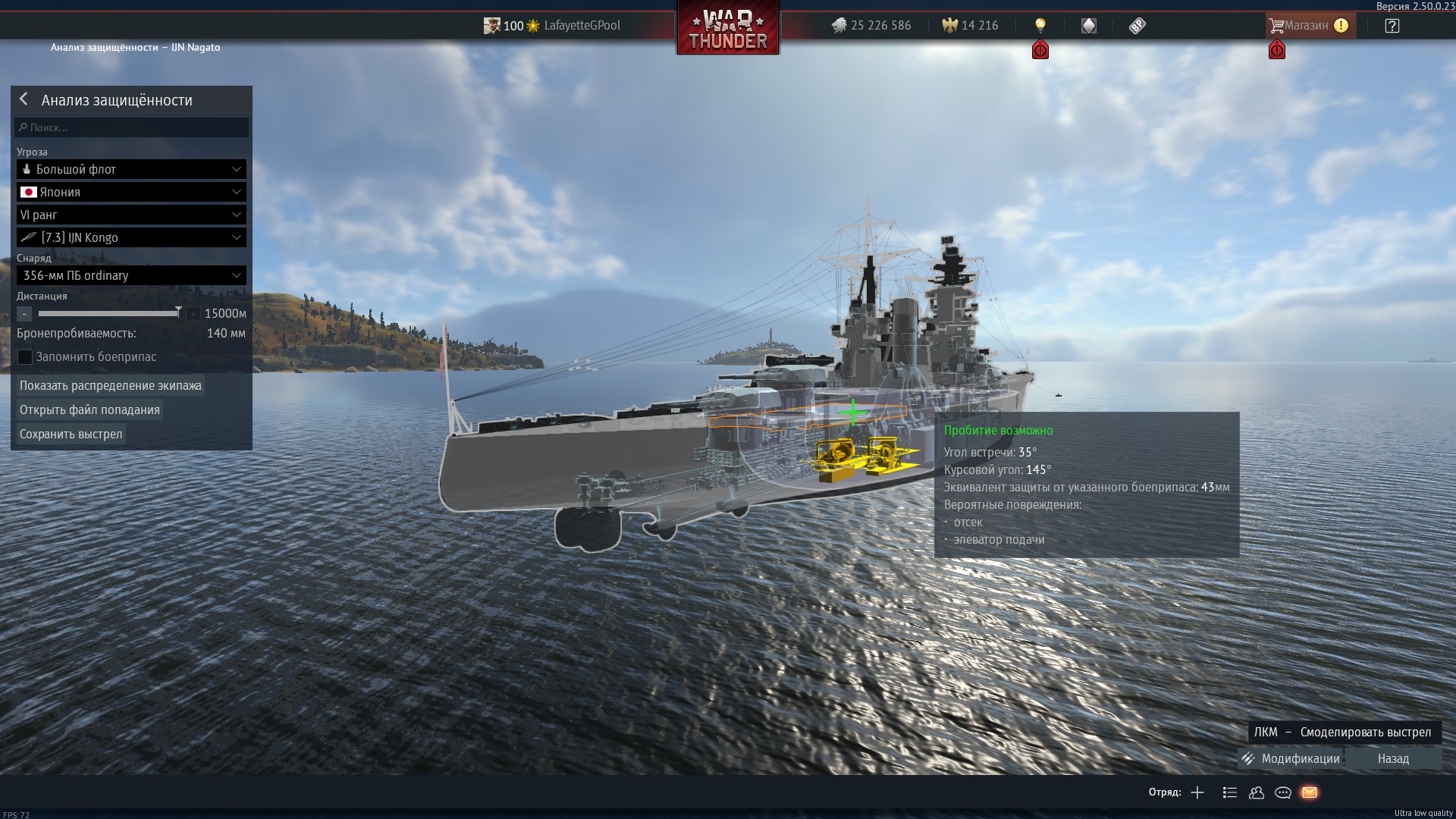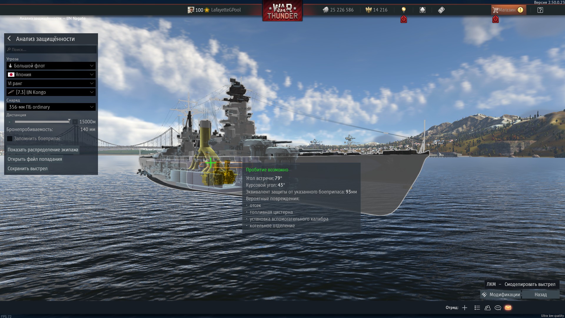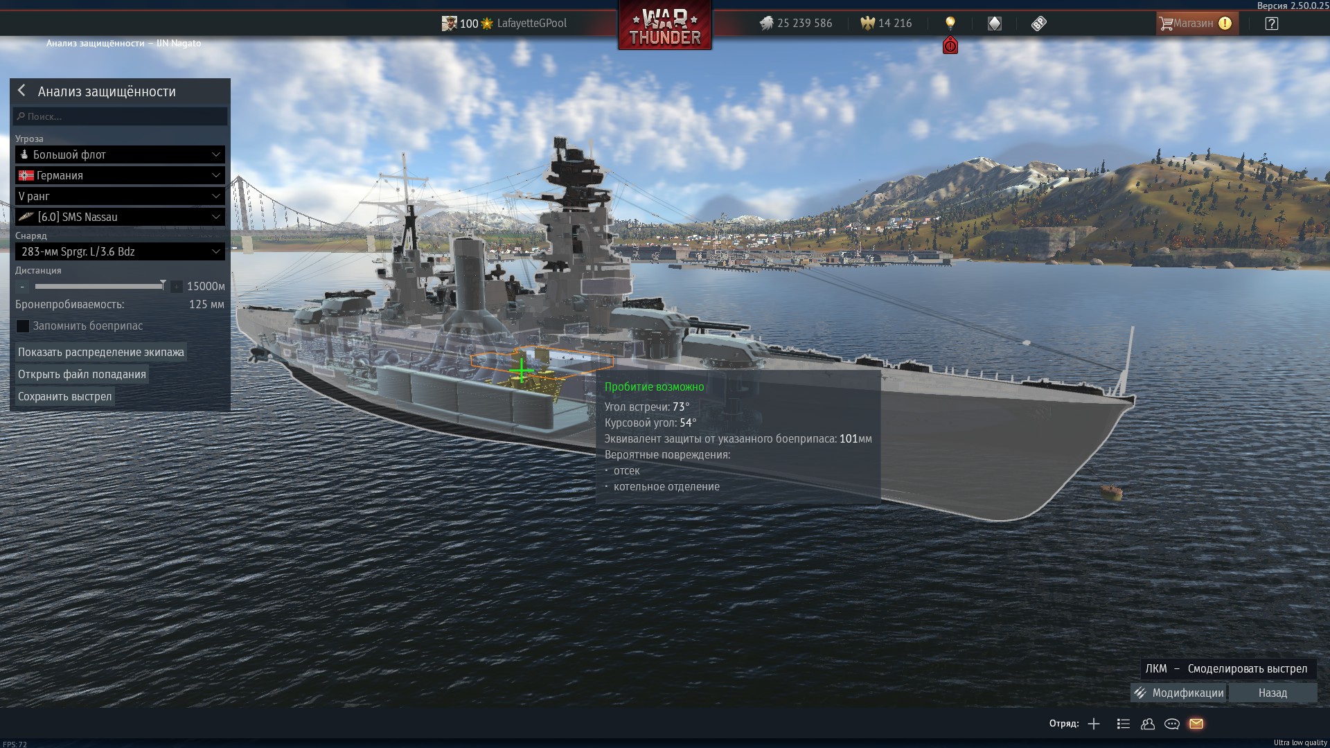 И это значит что 76мм "броне"палубы превращаются в 34.2 мм гомогенной стали и проламываются от калибра > 34.2*7=239,4мм. Поэтому получаем что самый слабый бот на Нассау стоковой ПБ шатает Нагато в машины на изи.