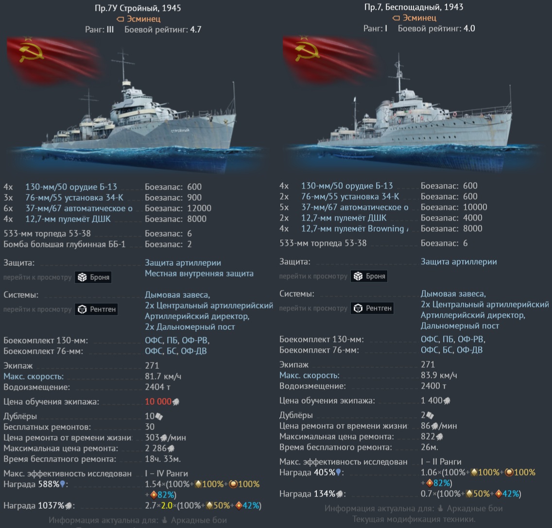 (МАБ) Пр.7У, Сообразительный 1943 и Пр.7У, Стройный 1945 4.7 > 4.3. На БРе 4,0 находится эсминец Пр.7, Беспощадный 1943 примерно с такими же характеристиками. Что эсминцы проекта 7У забыли на 4,7 вообще не понятно. По боевой эффективности Стройный и Сообразительный примерно равны Беспощадному (4,0) и Рьяному (4,3).